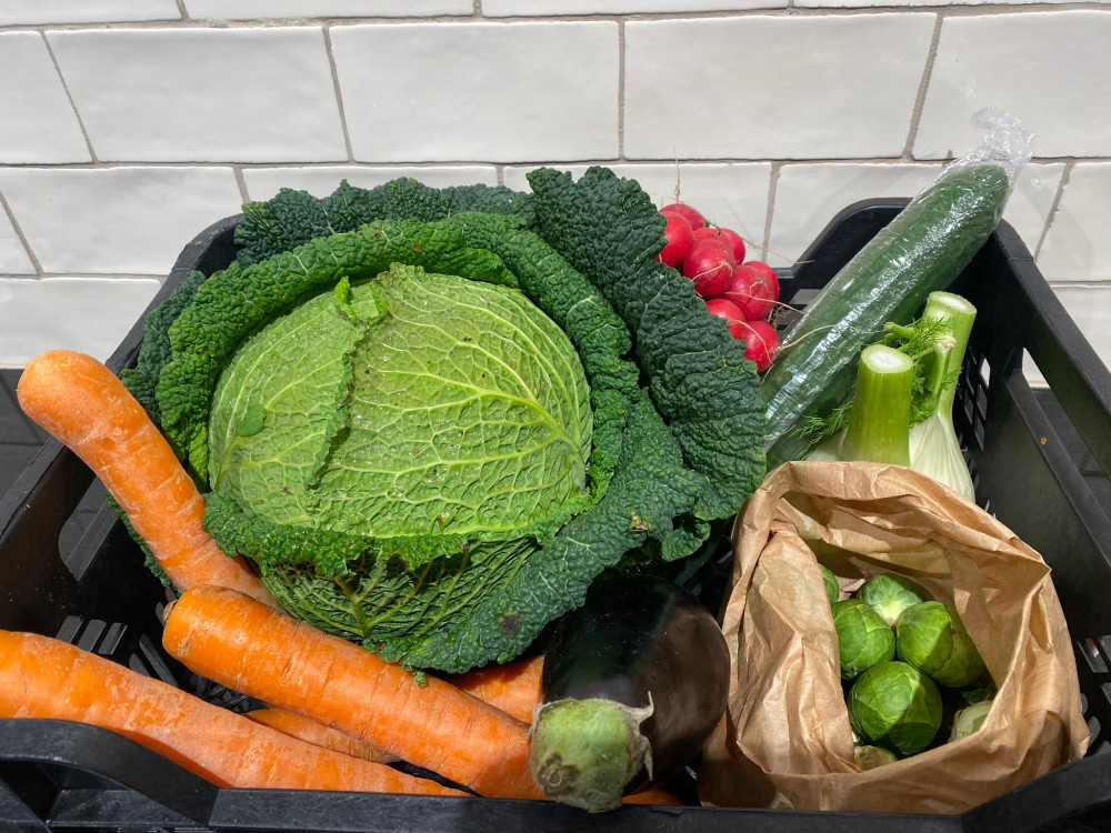 Groentencolli van de week met 4 wortelen, 1 savooikool, 1 radijs, 1 venkel, 1 komkommer, 1 aubergine en 300 gram spruiten.