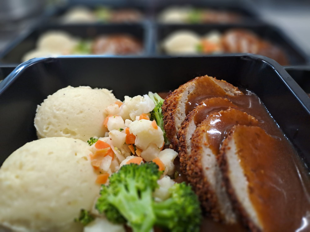 Gehaktbroodje in bruine saus met seizoensgroenten en puree
