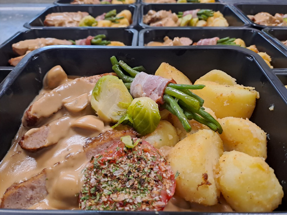 Kalkoenburger in champignonroomsaus met seizoensgroenten en gebakken aardappelen