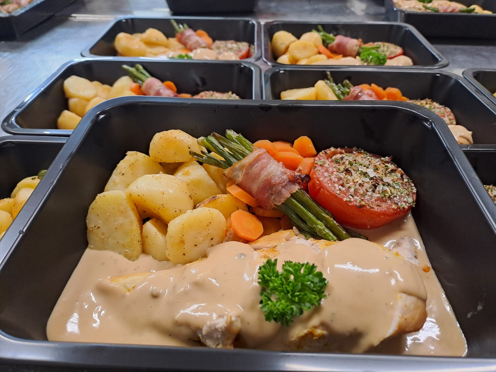 Kipfilet in peperroomsaus met seizoensgroenten en gebakken aardappelen